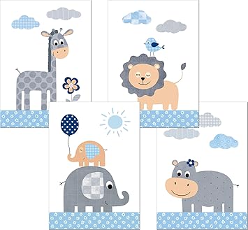 Artpin 4er Set Bilder Kinderzimmer Deko Junge Madchen Din A4 Poster Tiere Safari Afrika Wandbilder Portrat Elefant Tiger Giraffe Zebra P35 Amazon De Baby
