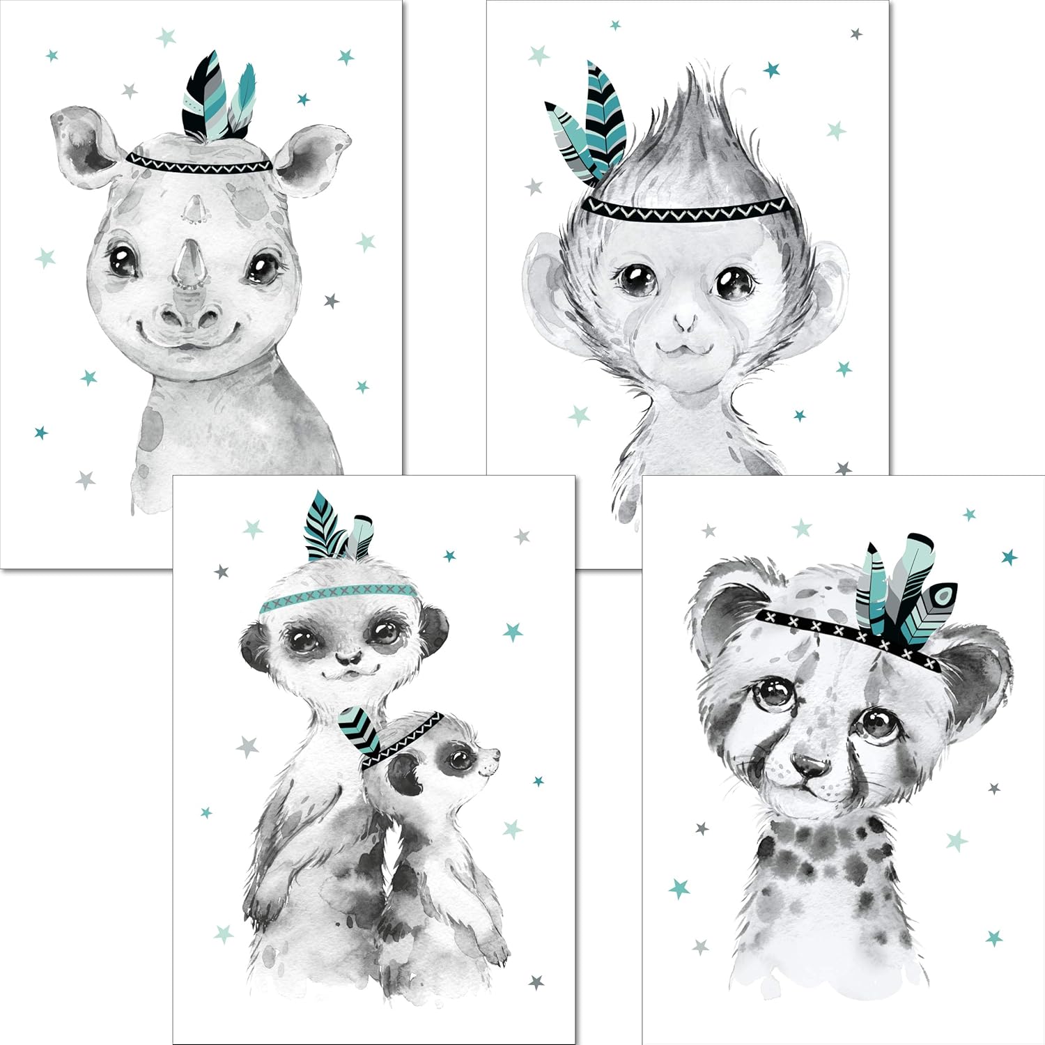 Lalelu Prints Bilder Kinderzimmer Mint Poster Deko Dschungel Tiere Indianer Deko Junge Madchen 4x Din A4 Kinderbilder Set Babyzimmer Babybilder Wandbilder Indianer 4er Set 2 Mint Grau